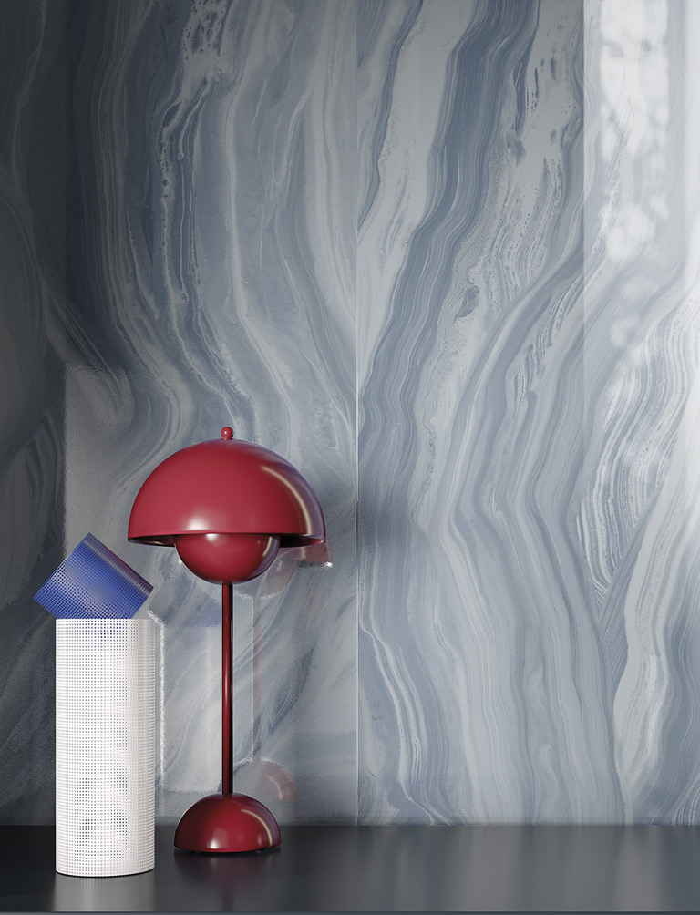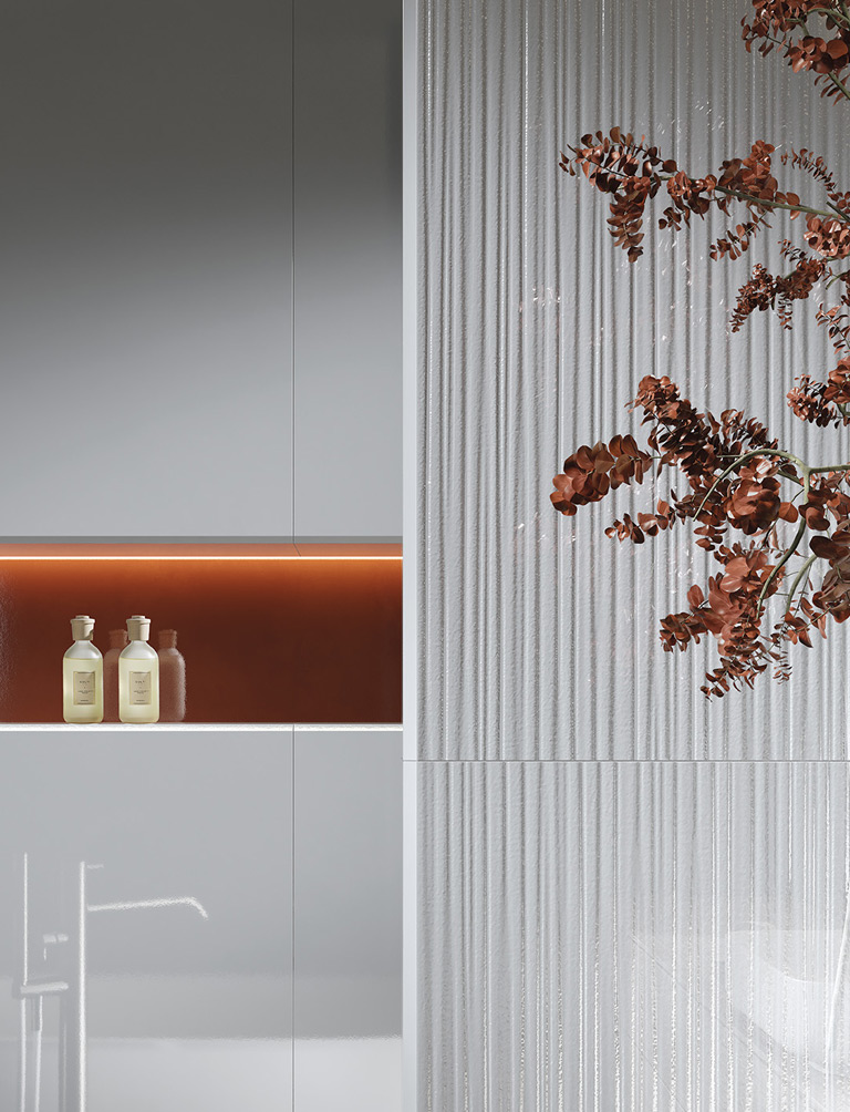 Three-dimensional textures, vibrant surfaces and different material effects dialogue with each other and with the light, as in this bathroom, where smooth, gleaming Materia Brillante ceramic tiles in Cielo and Borgogna shades meet the three-dimensional surface of Materia Brillante Riflessi Cielo, in a delightful interaction of colours and materials.