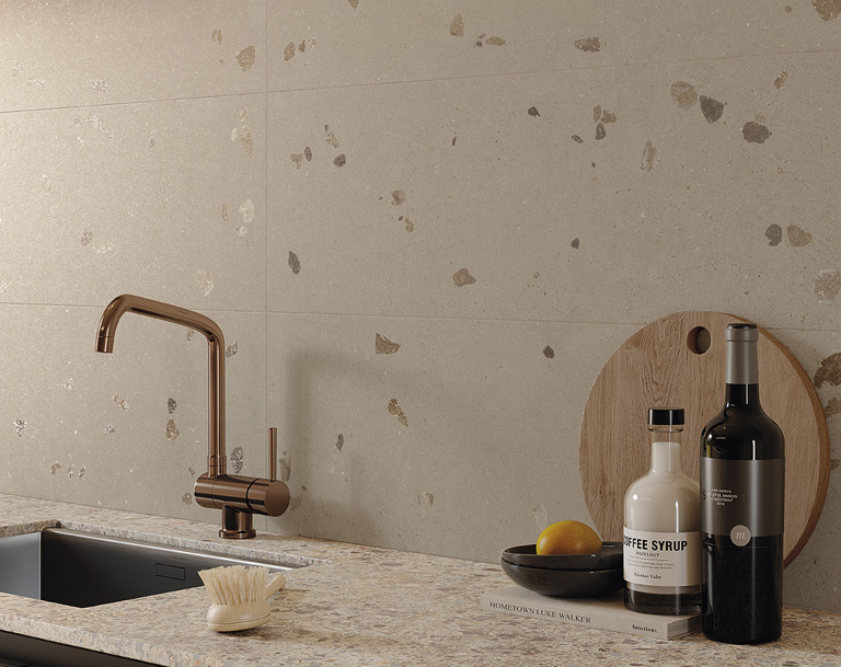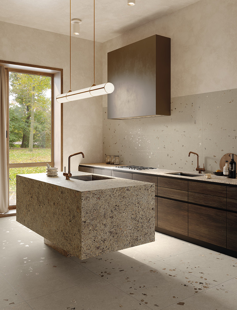 Materia Pura Sassi Tortora wall and floor tiles delight and surprise with the pearly pebbles and bright fragments that emerge on their surfaces, enlivening the interior dominated by a spectacular kitchen block in Materia Eclettica.