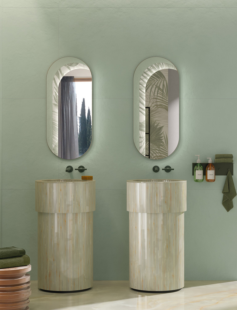 The Portal mirror is a curvy oval, symbolising harmony and balance, framed by the radiant ceramic surfaces of the GEMME collection in Cielo, Rosa, Bianco, Menta and Beige colours, which add light and depth to the mirror itself.