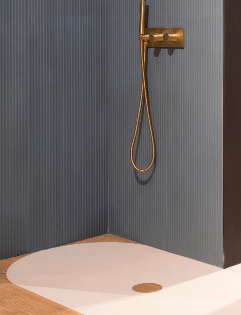 Shower trays made from thermoformed slabs for installation either flush with the floor (walk-in) or in raised version (step-over) on a 4 cm base, which can be covered with the same ceramic material as the floor for absolute continuity.
