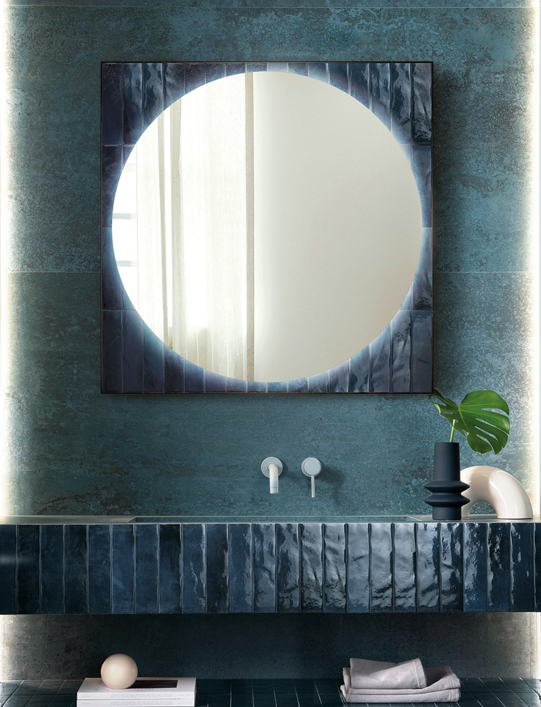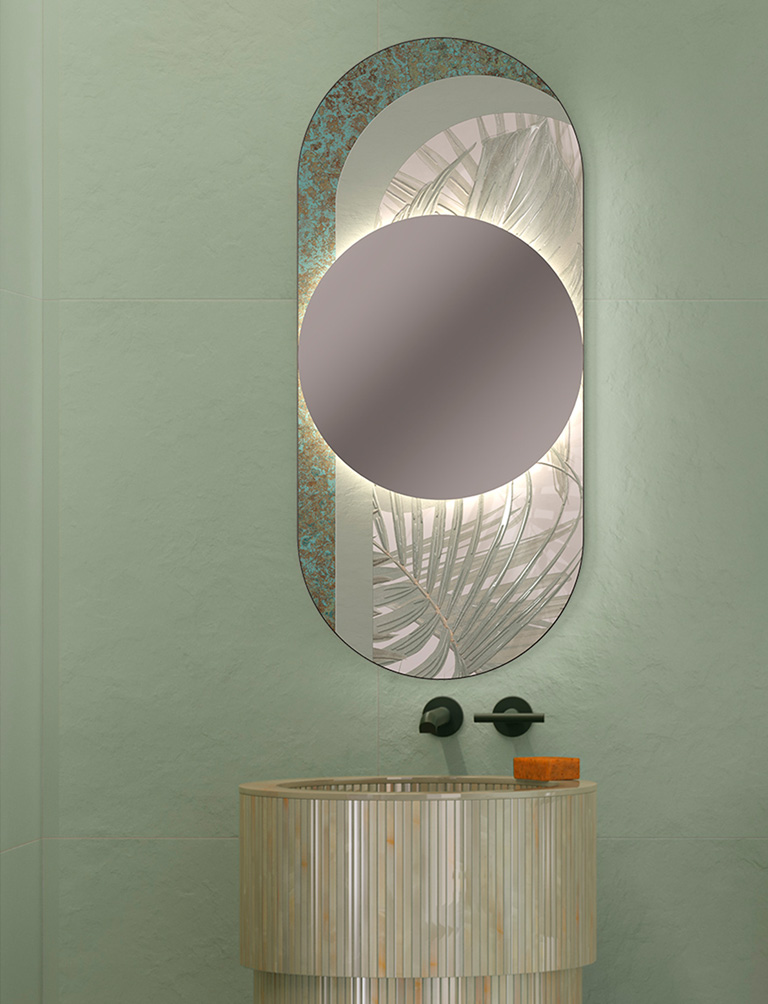 The Oblò mirror features three ceramic surfaces - Sheer Deco Rust, Color Mood Menta and Color Mood Tropical - in an attractive mix of material and decoration that highlights the backlit circular mirror in the centre, for an effect of great depth.