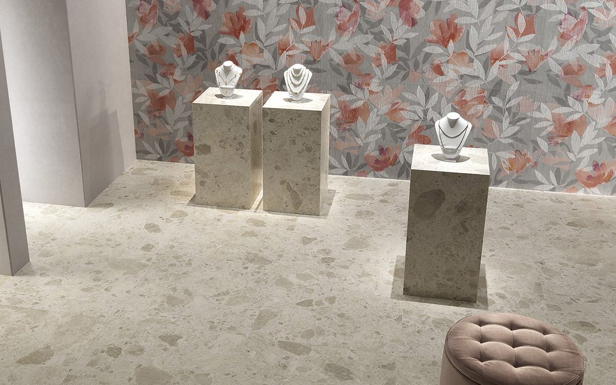 Эволюция керамики позволяет создавать впечатляющие и уютные естественные декорации, которые будто источают аромат природных ландшафтов. Они привносят в помещение дыхание свежести благодаря небольшому числу крупноформатной керамической плитки.