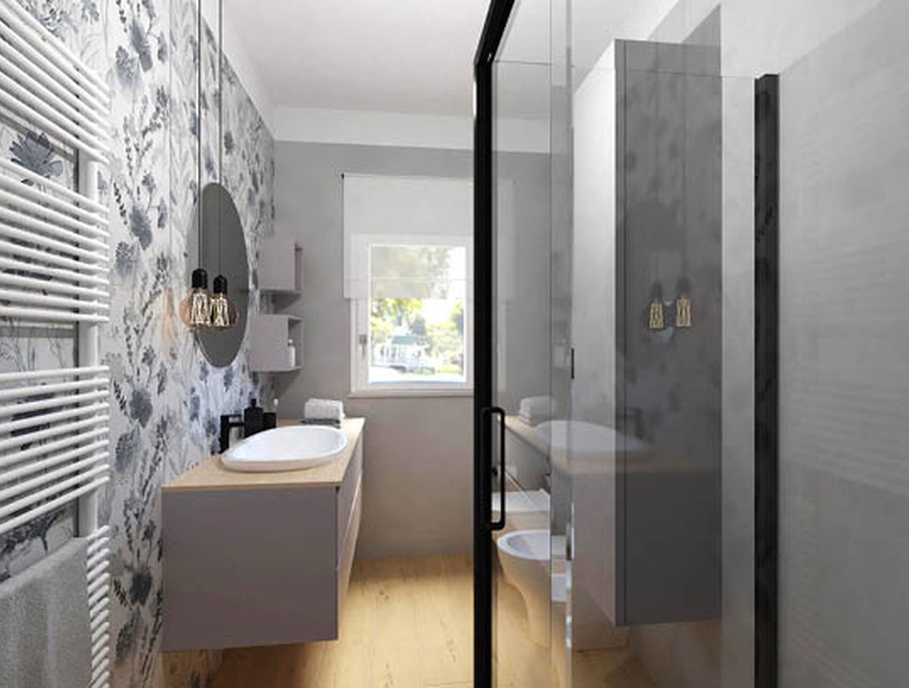 Изображение проекта ванной комнаты формы Прямоугольная, выполненного снапольной плиткой ROOTS и настенная плитка MILANO MOOD